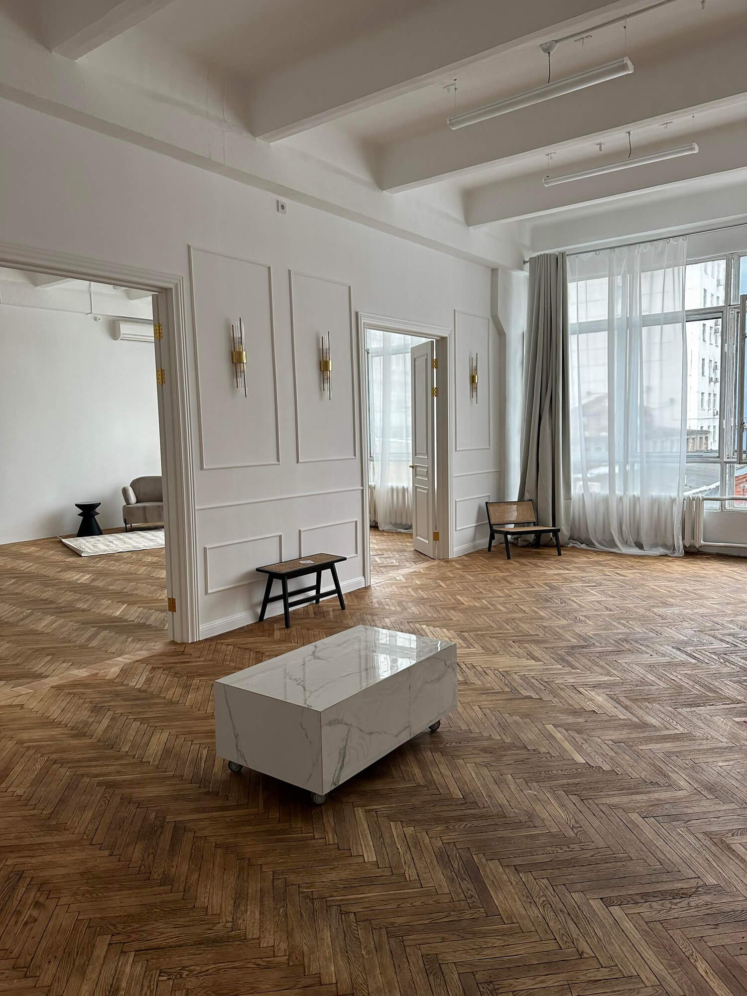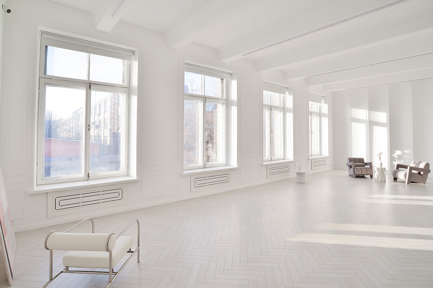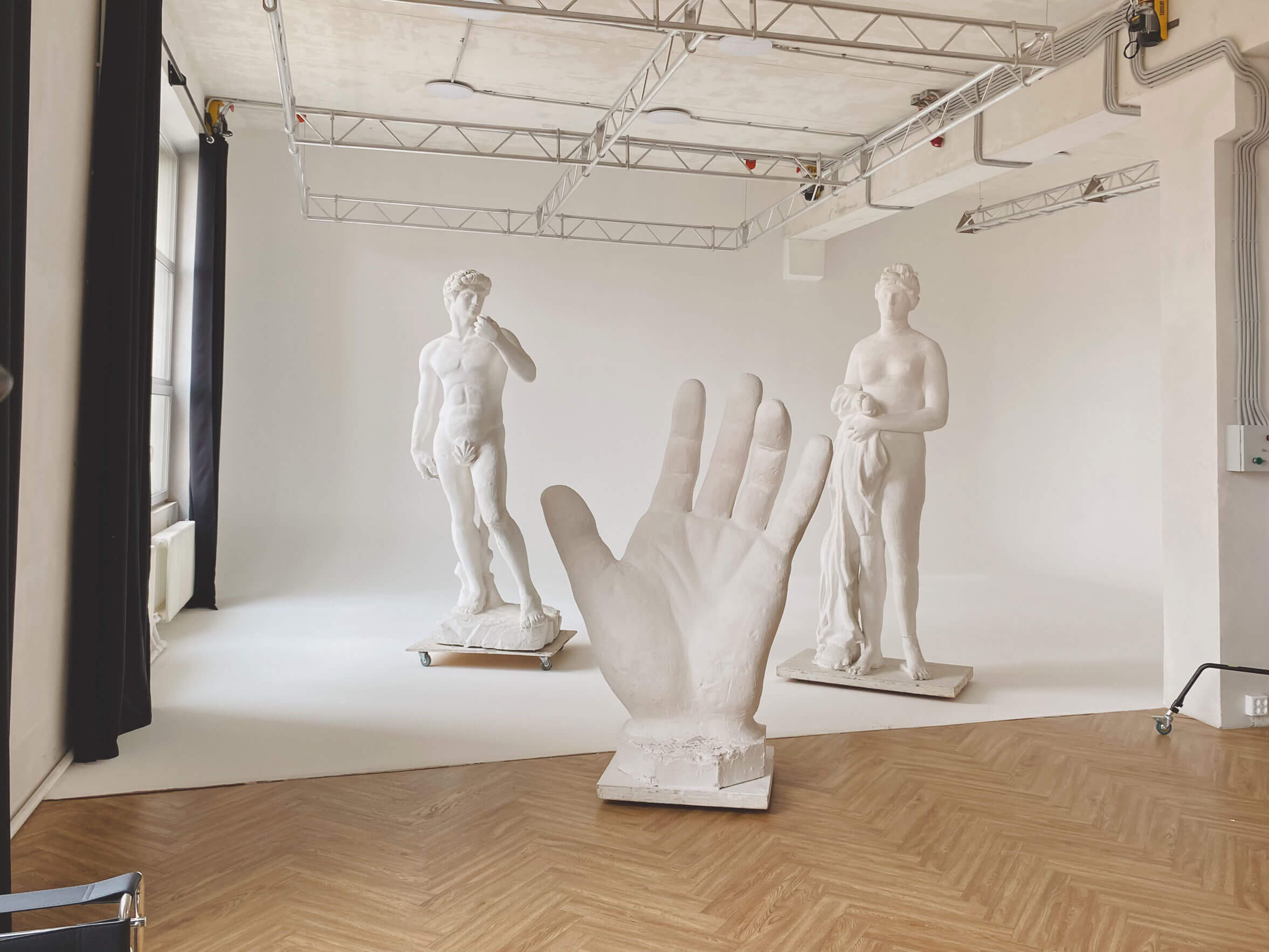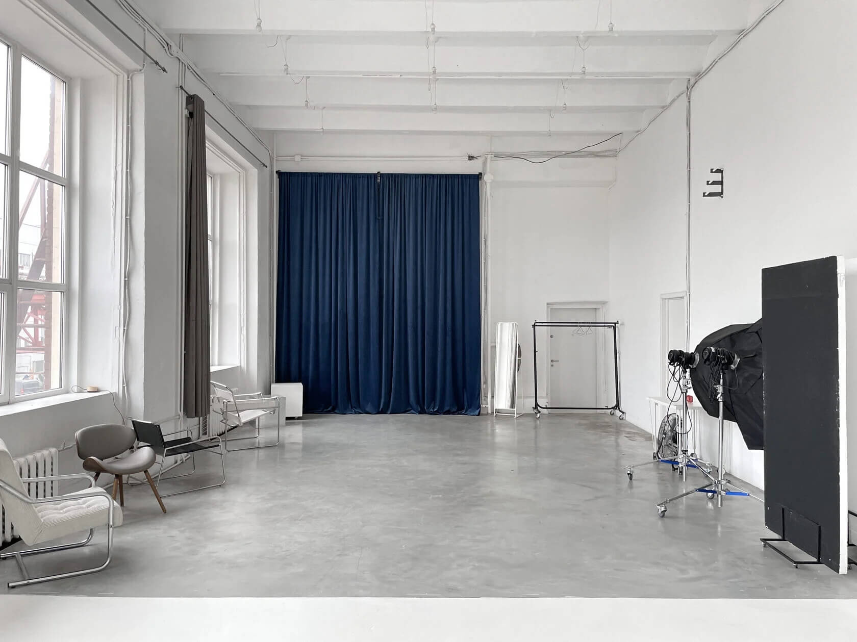 Кроме того, недавно открылся зал Oslo в скандинавском стиле с циклорамой. Здесь также есть отдельное гримерное место, которое уже входит в аренду. В Oslo — просторные панорамные окна, поэтому приток естественного света обеспечен. А регулировать освещение можно при помощи блэкаут-штор.