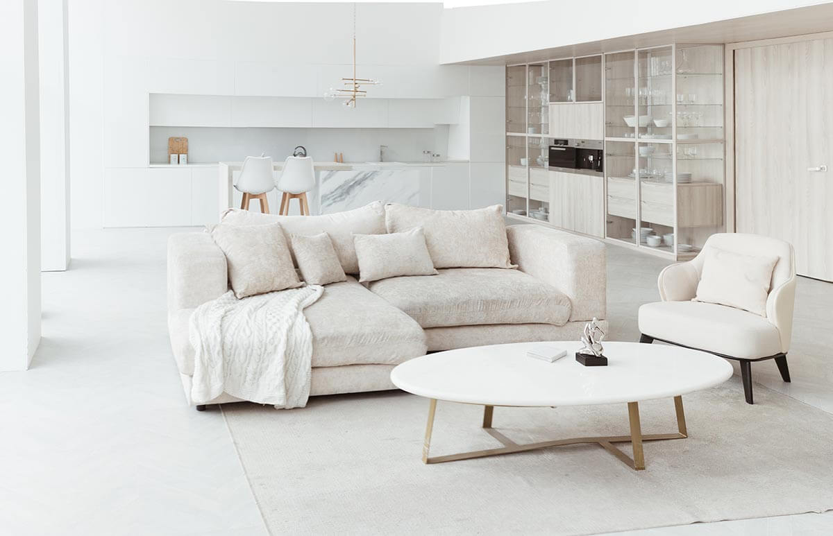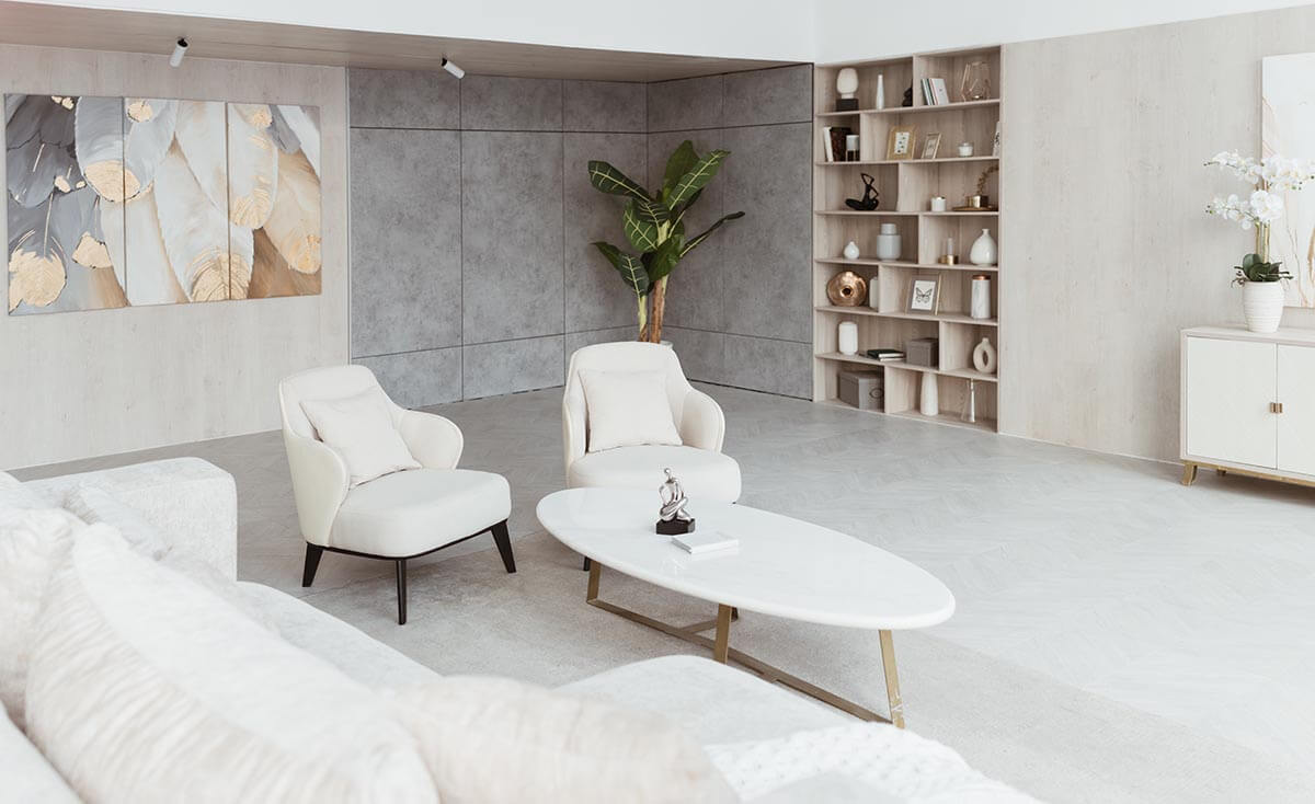 В студии четырнадцать залов. Есть и небольшие локации, около 45 кв. м, есть и довольно просторные — порядка 120 кв. м. Интерьер минималистичный, основная гамма — черно-белая с добавлением акцентных цветов. При этом первое, что заметно во всех залах без исключения, — это высокие панорамные окна. Они дают большой объем естественного света, поэтому фотографии получаются очень живые и динамичные. В некоторых локациях есть угловые панорамные окна, что добавляет еще больше света.