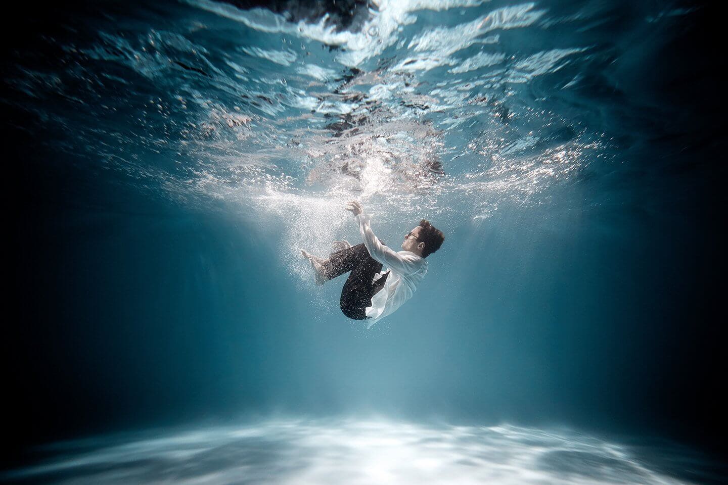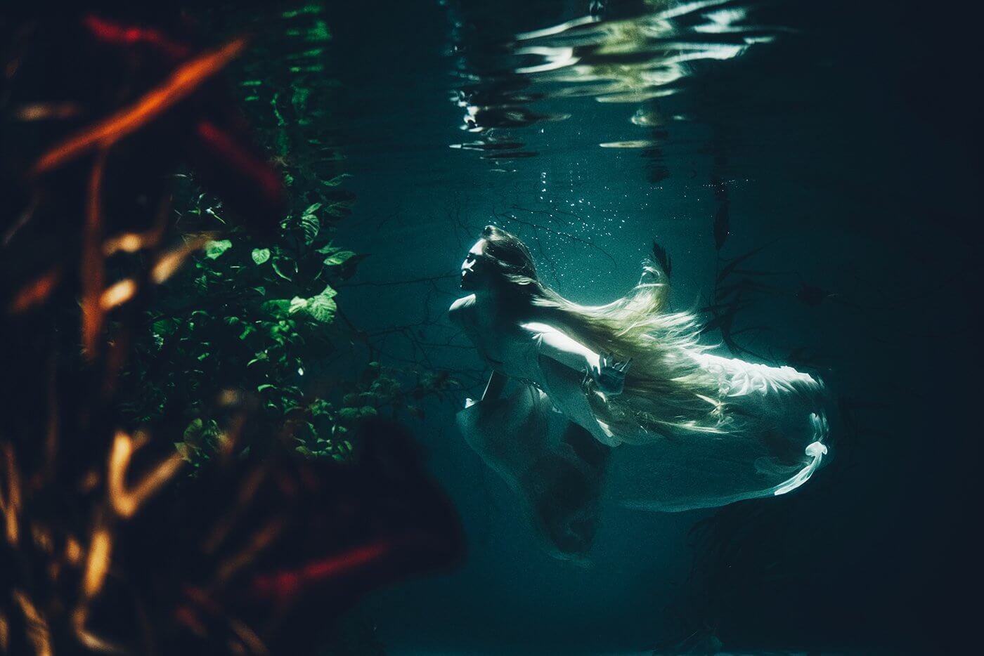 Модель погружается в воду и следует указаниям фотографа. «Но как она услышит фотографа под водой?» — спросите вы. Общение в процессе подводной съёмки осуществляется с помощью радиогарнитуры. Если бы не гарнитура, модели пришлось бы подниматься на поверхность каждый раз, запоминать наизусть команды фотографа и пытаться выполнить поставленную задачу. Подсказать непосредственно во время фотосессии, какую позу принять и что нужно делать было бы попросту невозможно.