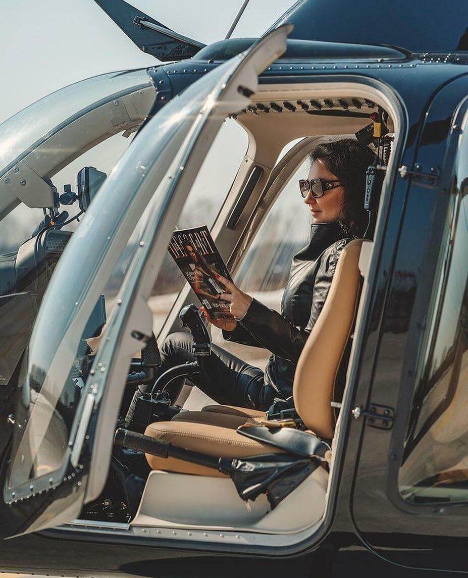Кстати, в Private Jet Studio можно устроить не только фотосессию в частном самолете. Есть и еще одна интересная опция — съемки на вертодроме. Вертолет Bell 407 — прекрасное решение для съемок. Он хорош и с технической, и с эстетической точек зрения. В кадре он смотрится органично, корпус довольно компактный и вместе с тем впечатляющий, при этом в композиции вертолет не перетягивает на себя все внимание, так что вы не потеряетесь на фоне огромной мощной машины. Особенно приятно, что съемки можно проводить и на вертодроме, и в кабине — то есть больше разнообразия и возможности сделать хороший кадр.