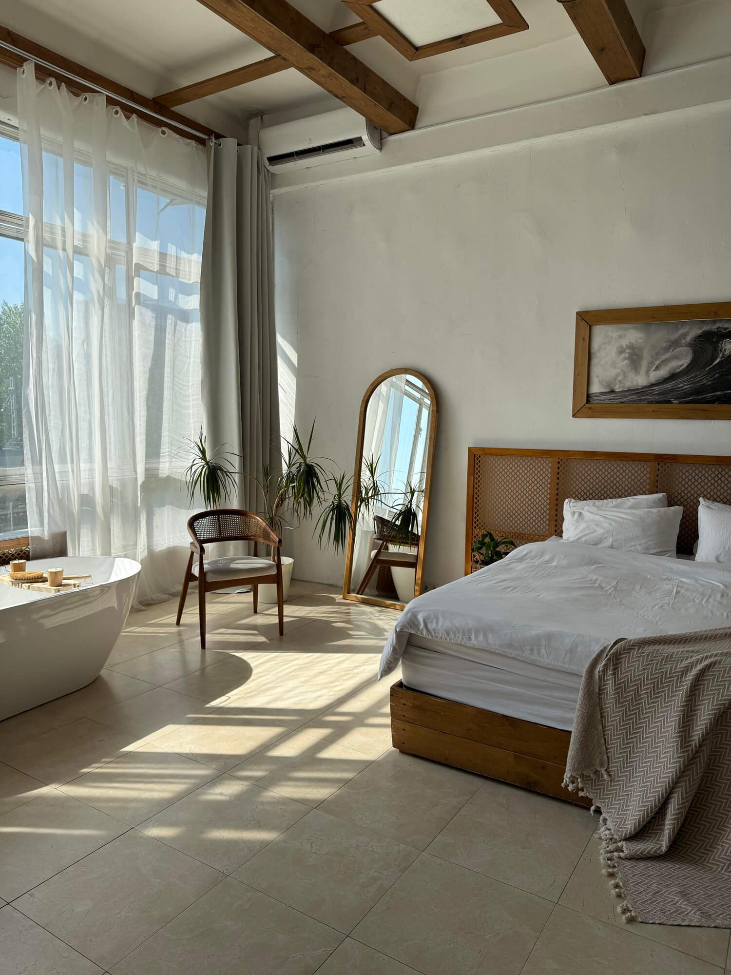 Среди залов самый просторный — Bali в индонезийском стиле. Отличное место для романтических фотосессий или для рекламных съемок. Здесь светлый интерьер в пастельных тонах, просторные панорамные окна, широкая кровать и главная особенность локации — рабочие душ и ванна. По предварительному согласованию в ванну можно добавить краски или молоко.