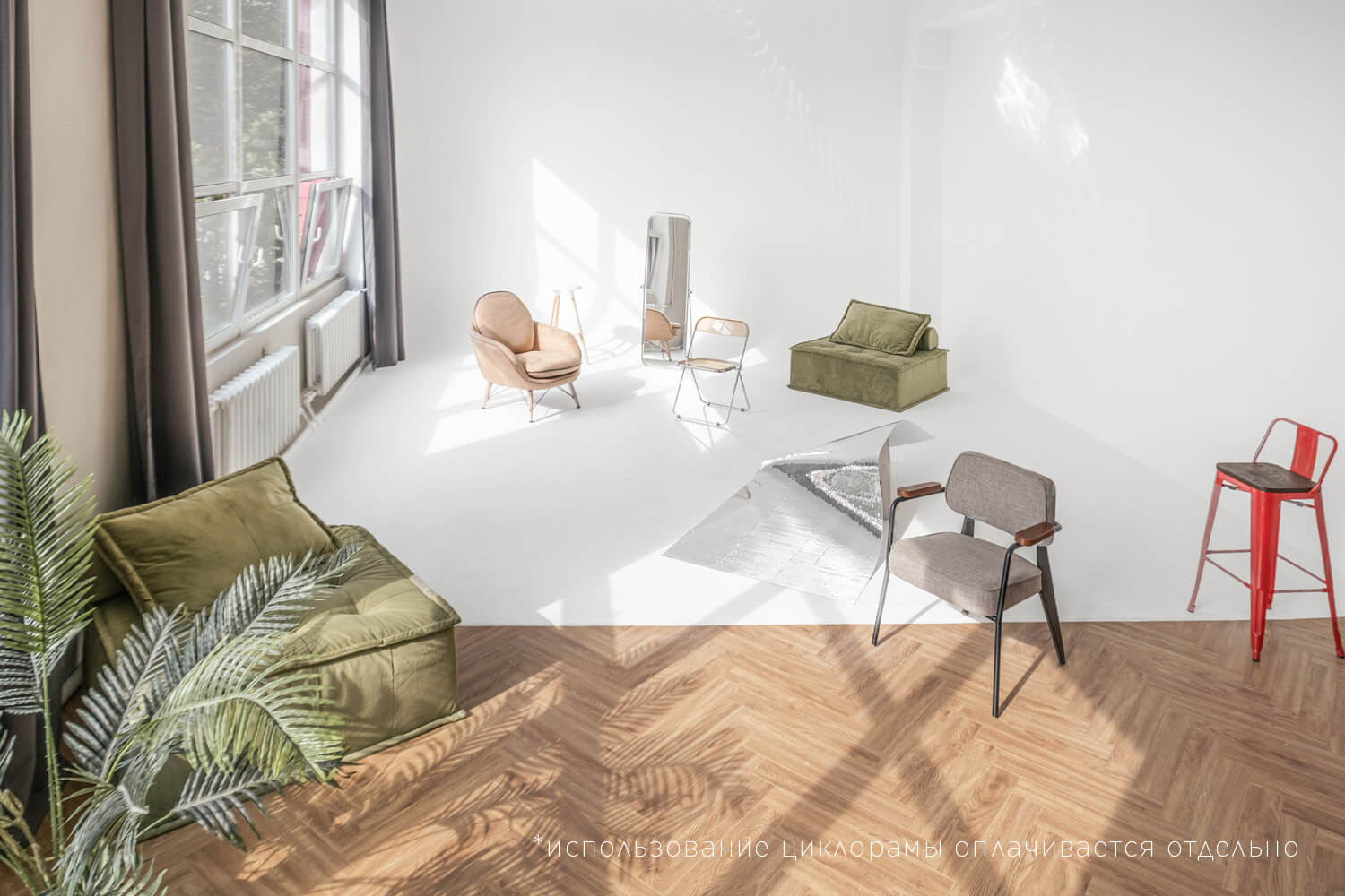 Среди других удобных преимуществ 13.POINT — возможность арендовать оборудование на месте. В наличии, например, импульсный и постоянный свет, отражатель, штатив для телефона, флаги — черный и белый. Есть также профессиональный вентилятор. Имеется и циклорама, которую, кстати, можно покрасить по дополнительному согласованию. Часть оборудования, что особенно радует, доступна бесплатно, то есть стоимость фотосессии не возрастет, а качество увеличится в разы.